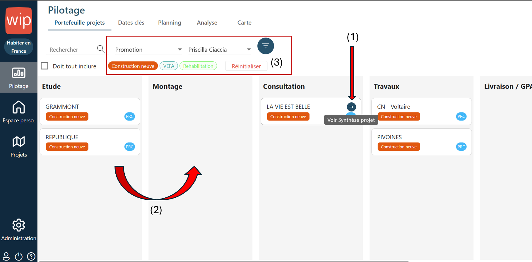 - Filtrez par catégories de projets et/ou par responsable (3)