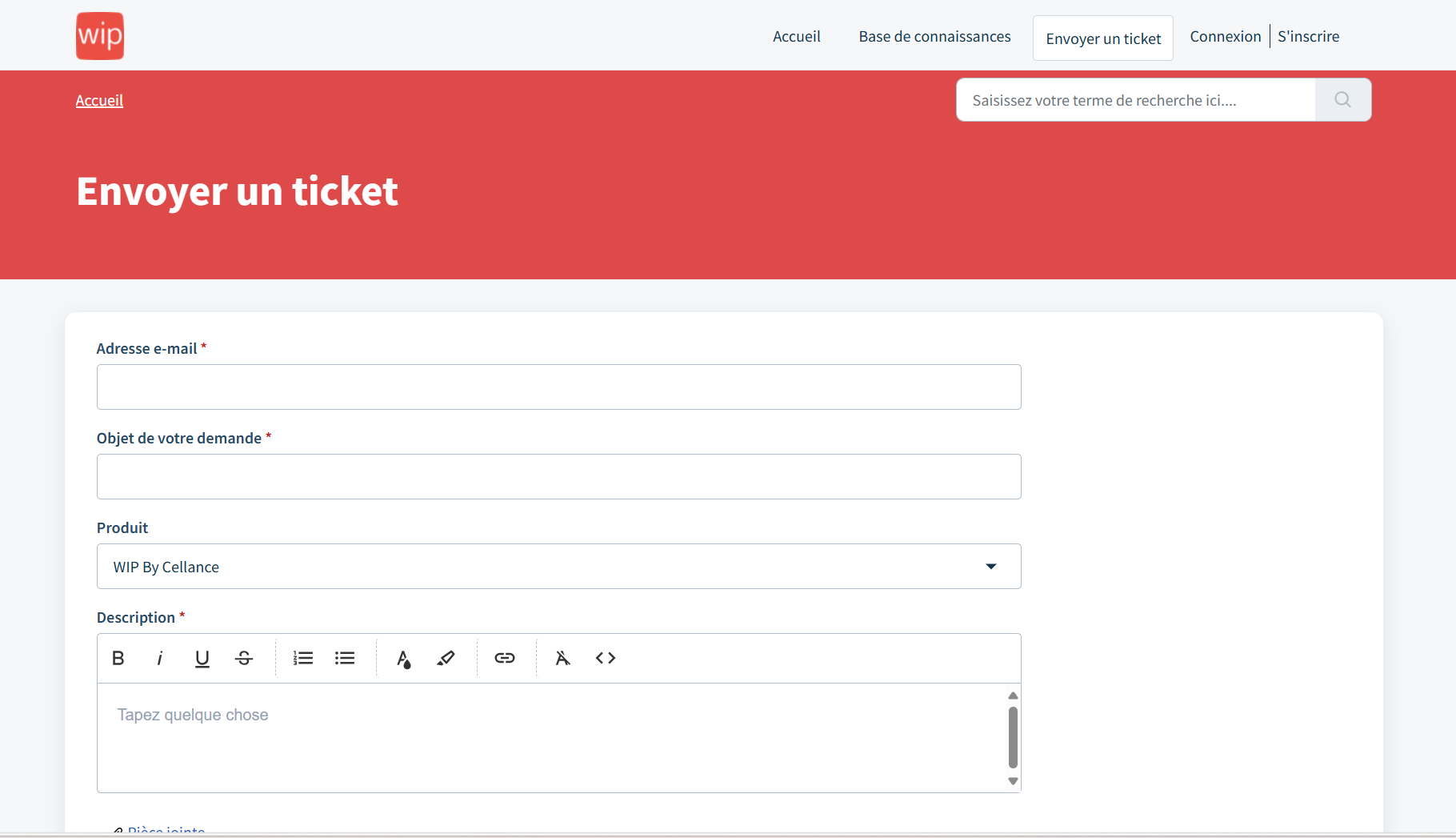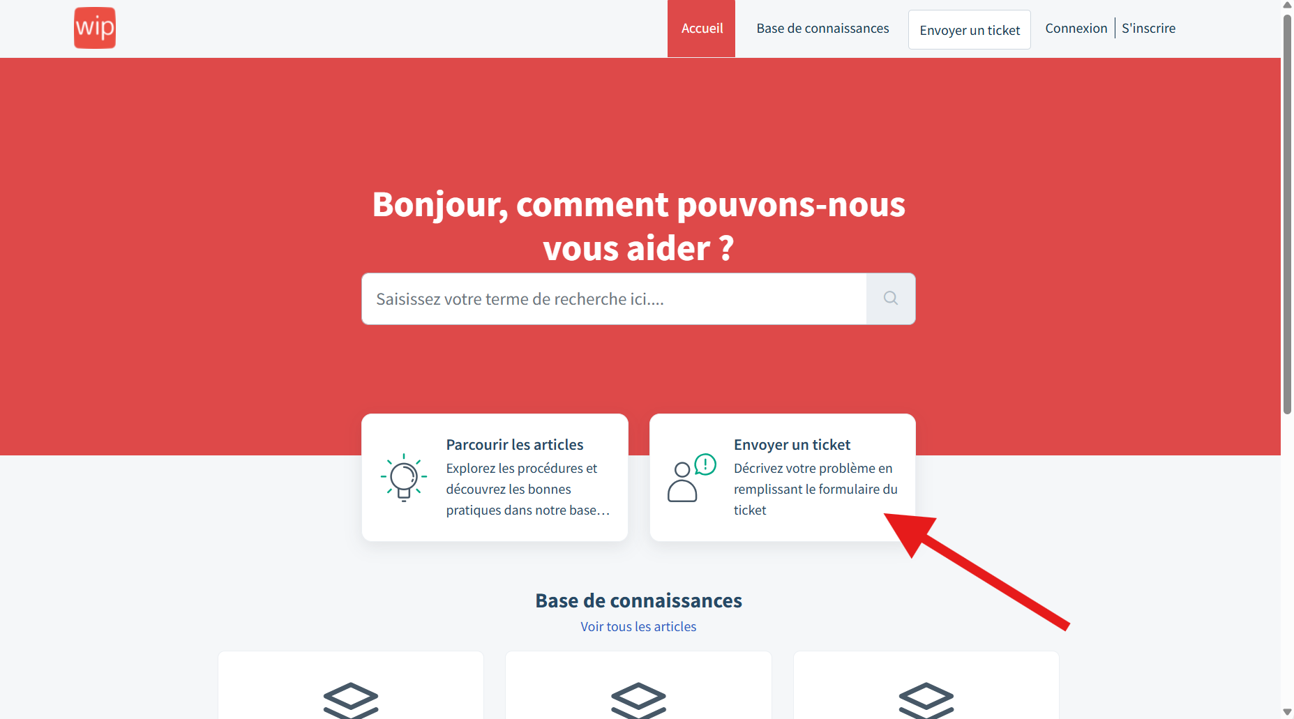 2. Vous tomberez notre page d'accueil WIP, cliquez sur "Envoyer un ticket"