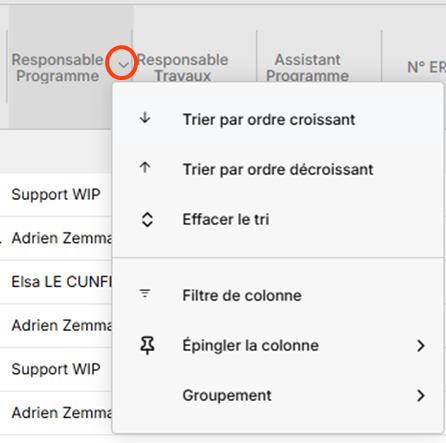 - Dans les colonnes concernées par le filtre, sur la flèche à droite de l'intitulé :