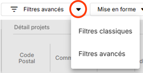 Les colonnes sélectionnées seront les seules à être filtrées. Plus de détails dans l'article sur les tris sur les colonnes, il est disponible en cliquant ici. - Dans les filtres avancés, en cliquant sur la flèches :