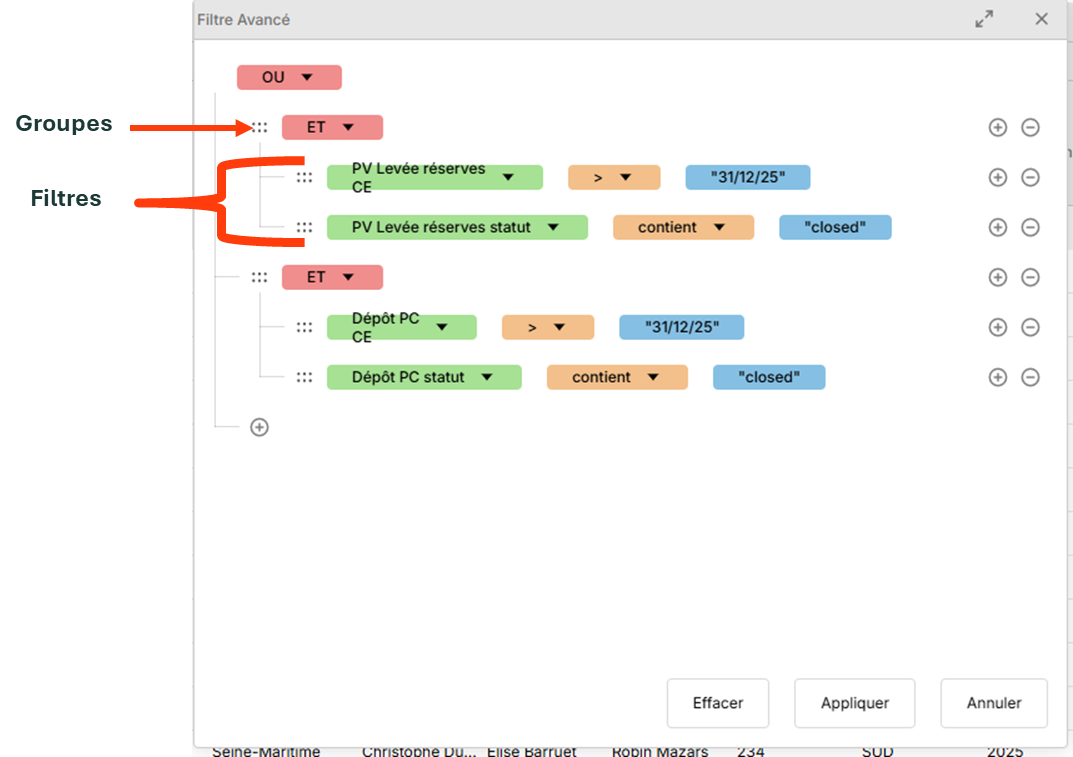 En choisissant « Filtres avancés », il est possible d’appliquer des filtres cumulatifs en manipulant les filtre et les groupes de filtres. Voici un exemple de filtres cumulatifs :